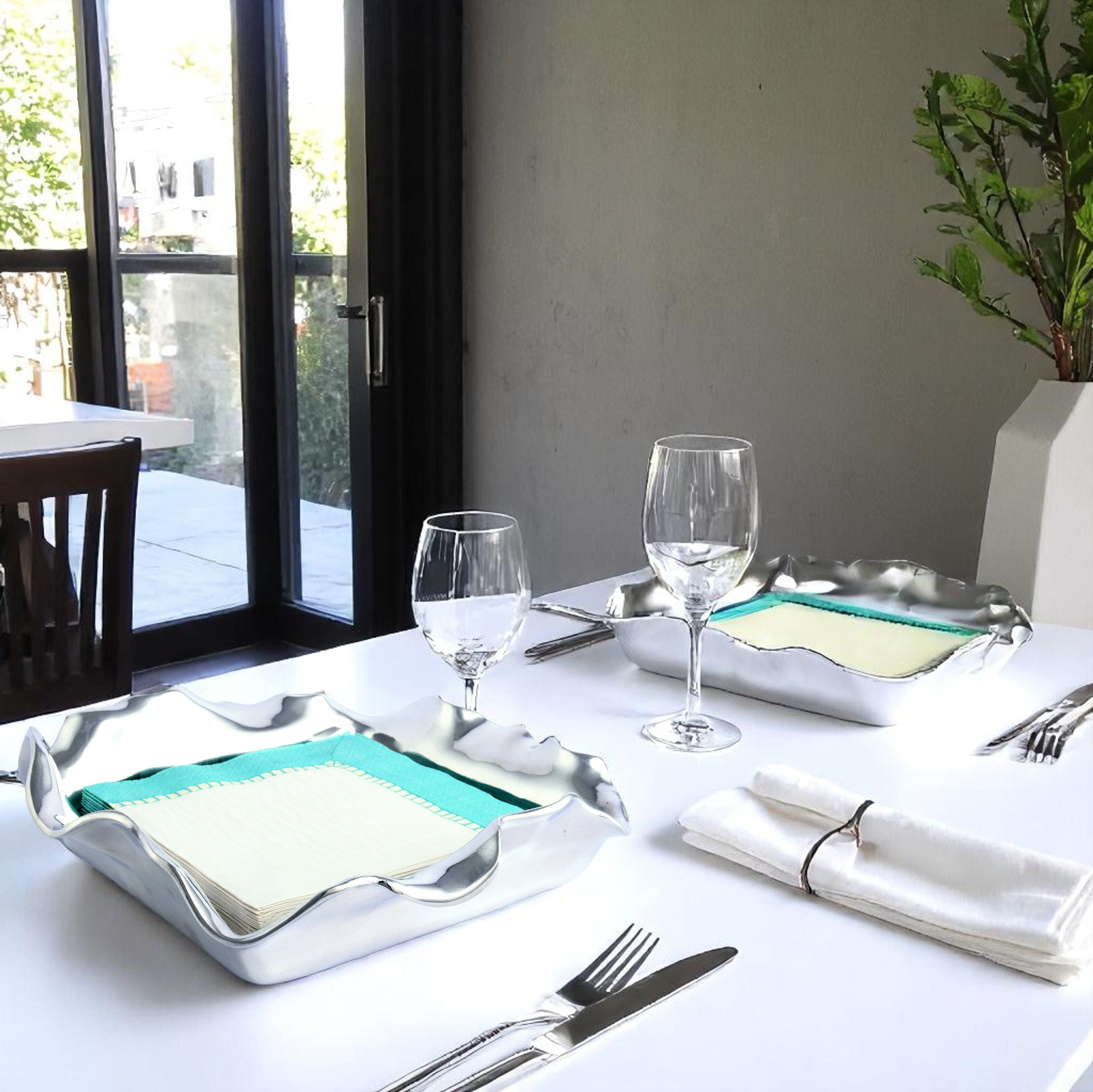 Our Premium Aluminum Napkin Box for Holiday Dinners not only adds an artistic touch to your gatherings but is also a hallmark of sophistication and refinement. Inspired by the Carmel Napkin Box, it is an essential for sophisticated entertaining. With its premium quality and exclusive design, this Arthur Court Napkin Box also makes for a thoughtful wedding gift idea. Crafted meticulously with precision, it measures with perfect dimensions to hold your dinner napkins elegantly. Its versatility allows it to seamlessly blend into any setting while standing out with its distinctive design.