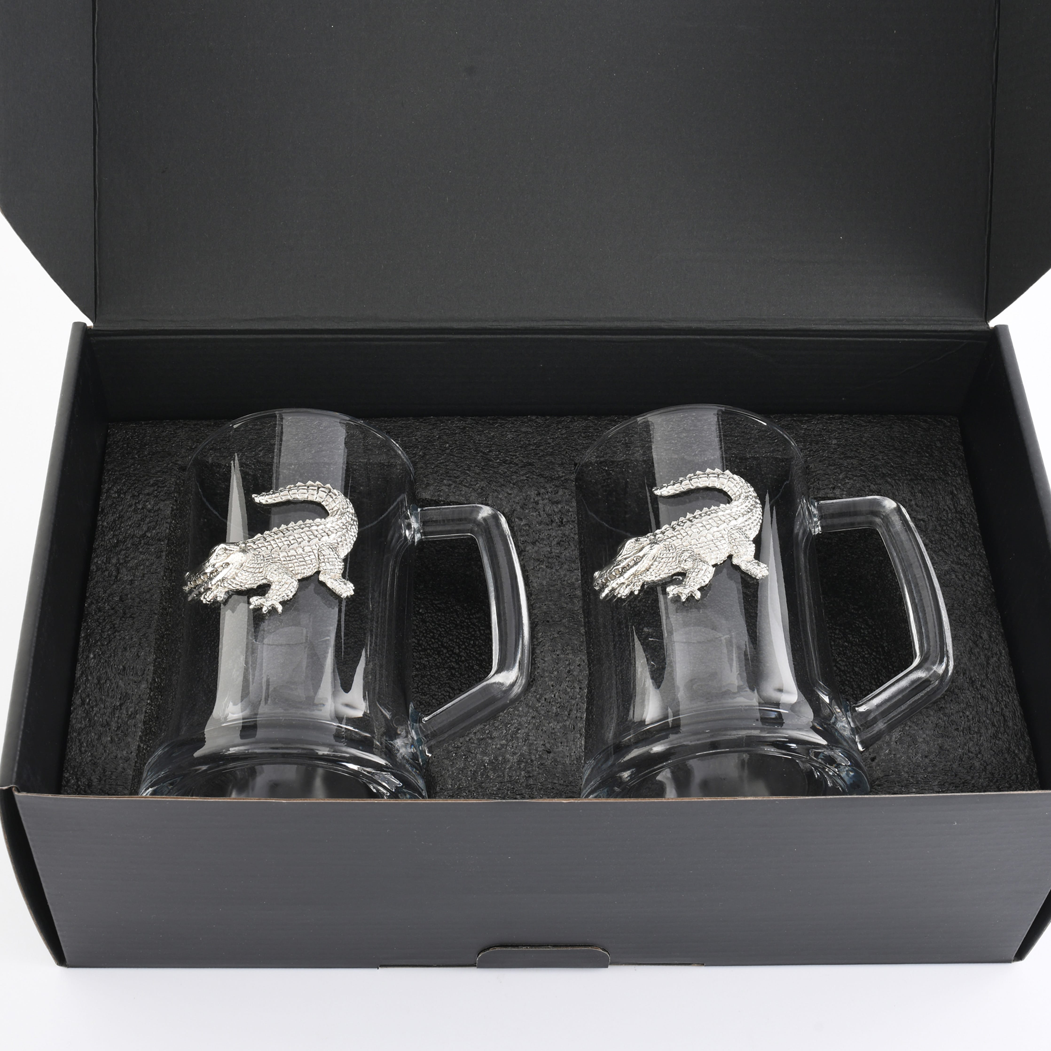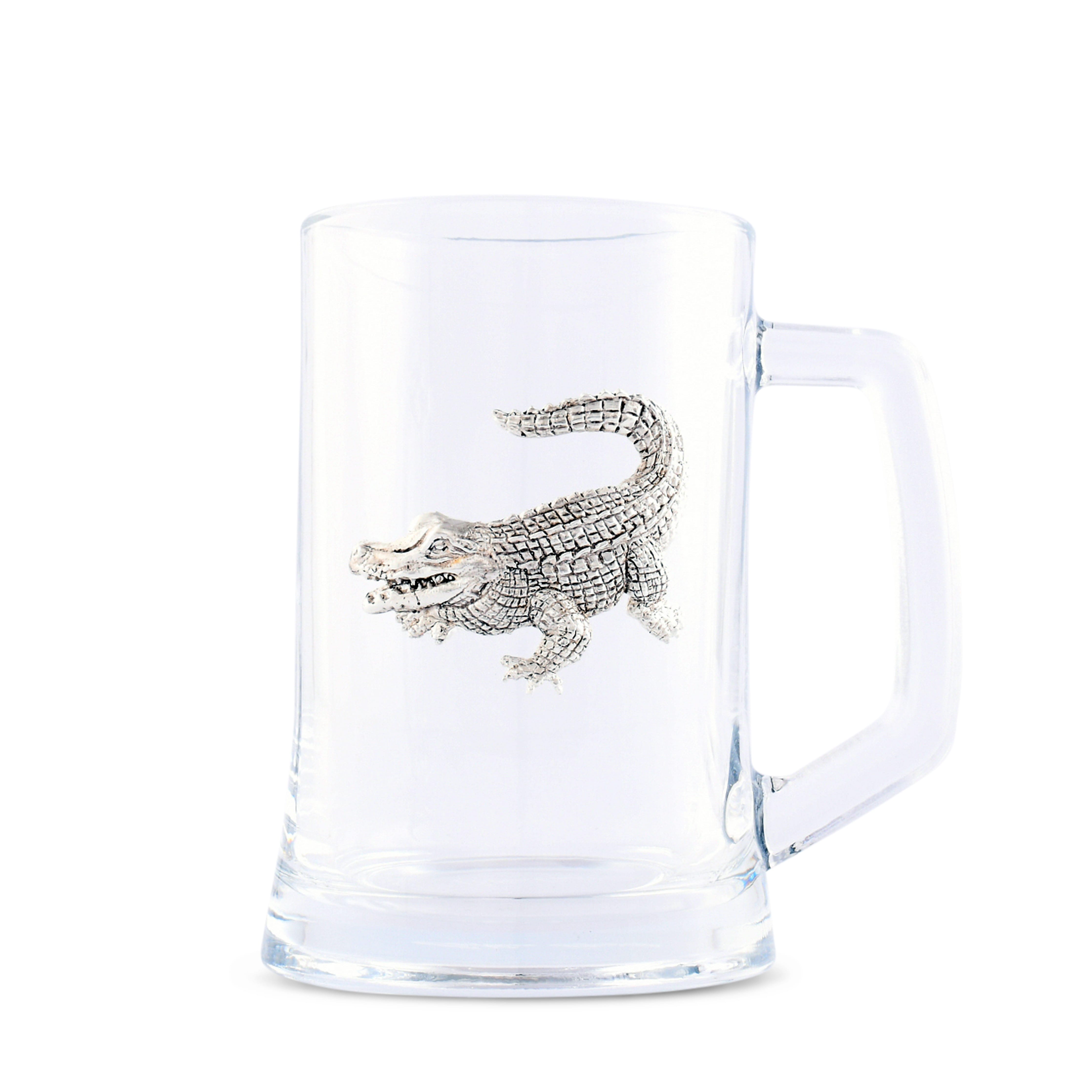 Add a bold, swamp-inspired touch to your drinkware with this set of two beer mugs from Arthur Court. Made from thick, durable glass with sturdy handles, each mug features a striking alligator medallion, crafted in signature aluminum alloy for a unique and rugged accent. Perfect for wildlife enthusiasts and beer lovers, these mugs are ideal for entertaining or as a distinctive gift. Pair them with other alligator-themed pieces from Arthur Court for a coordinated collection.