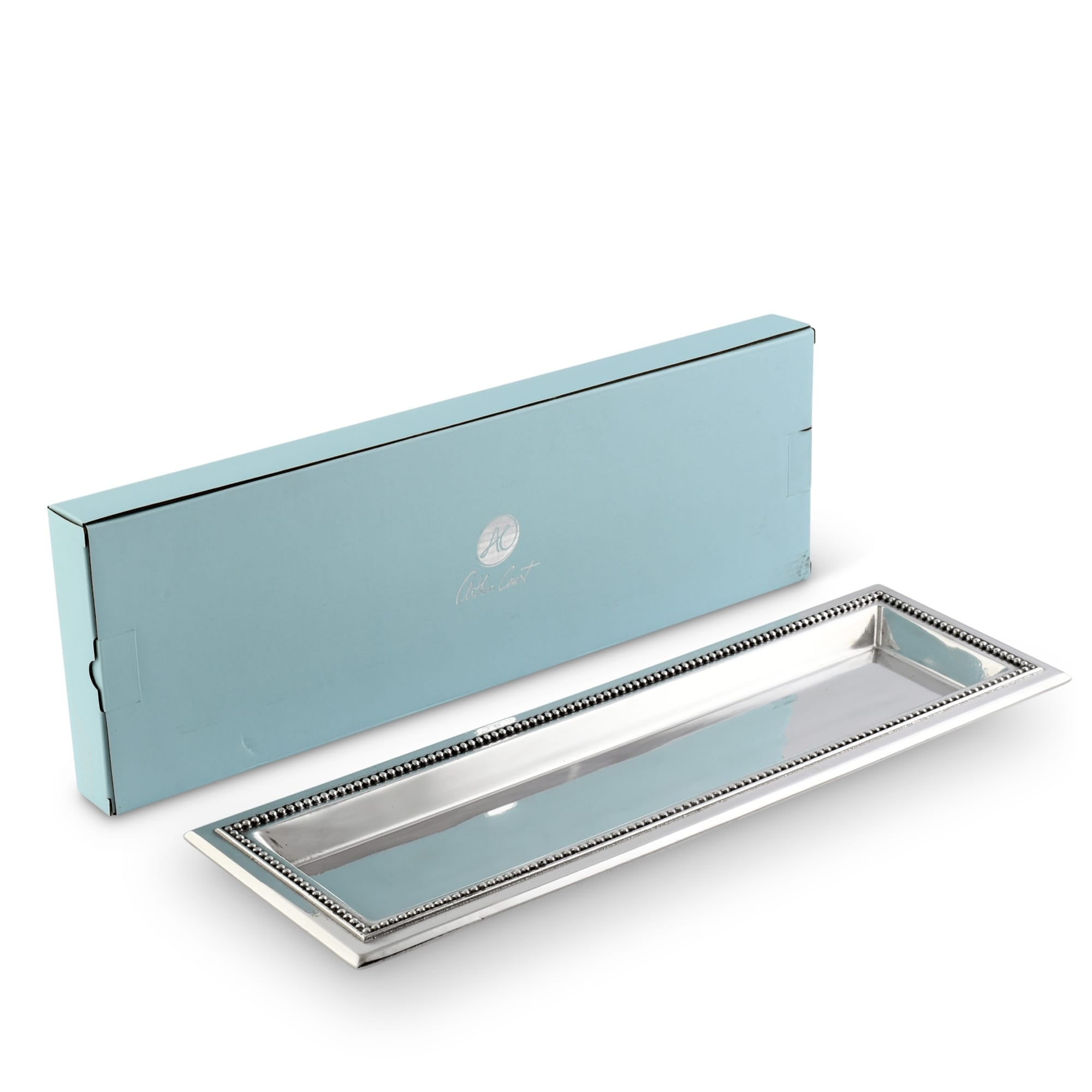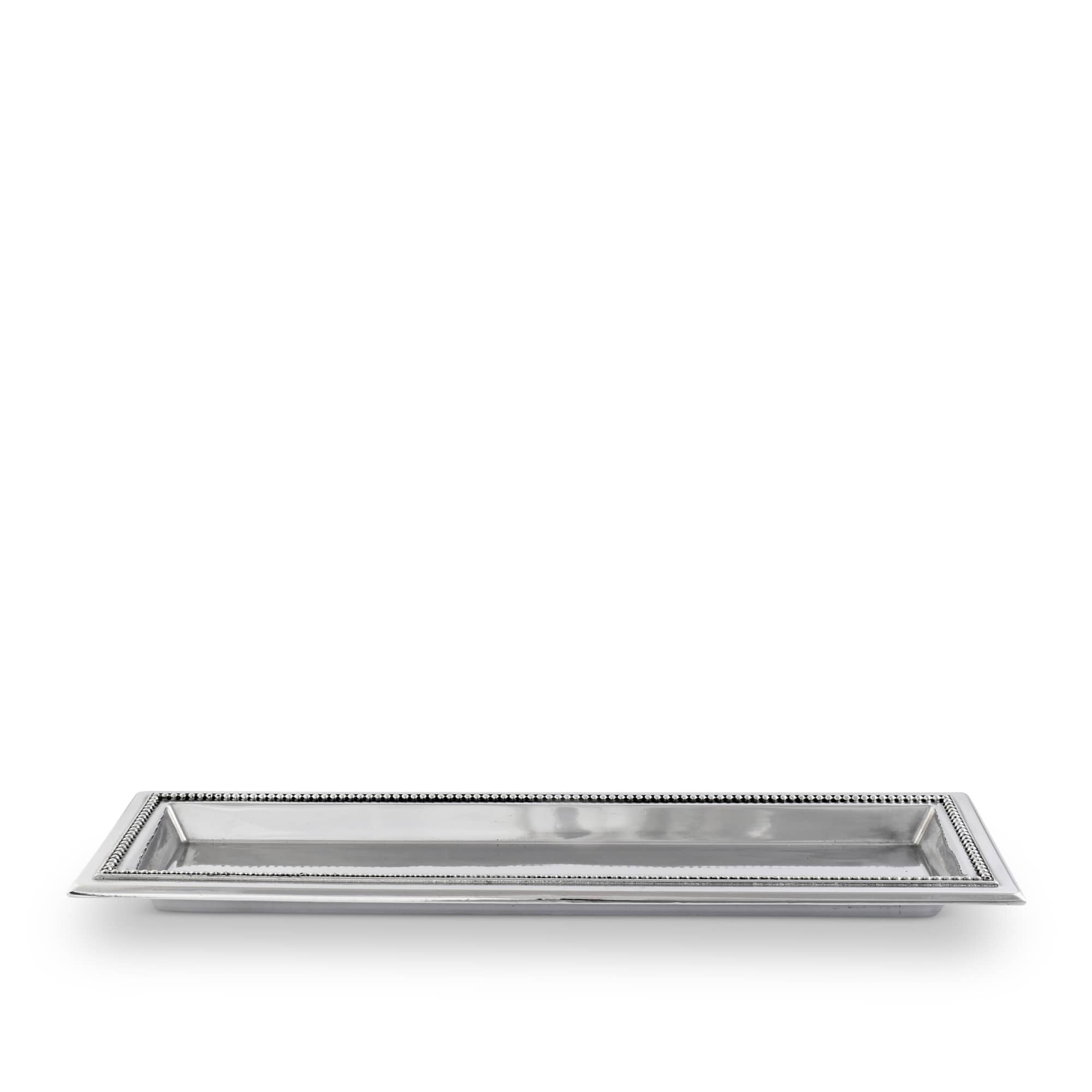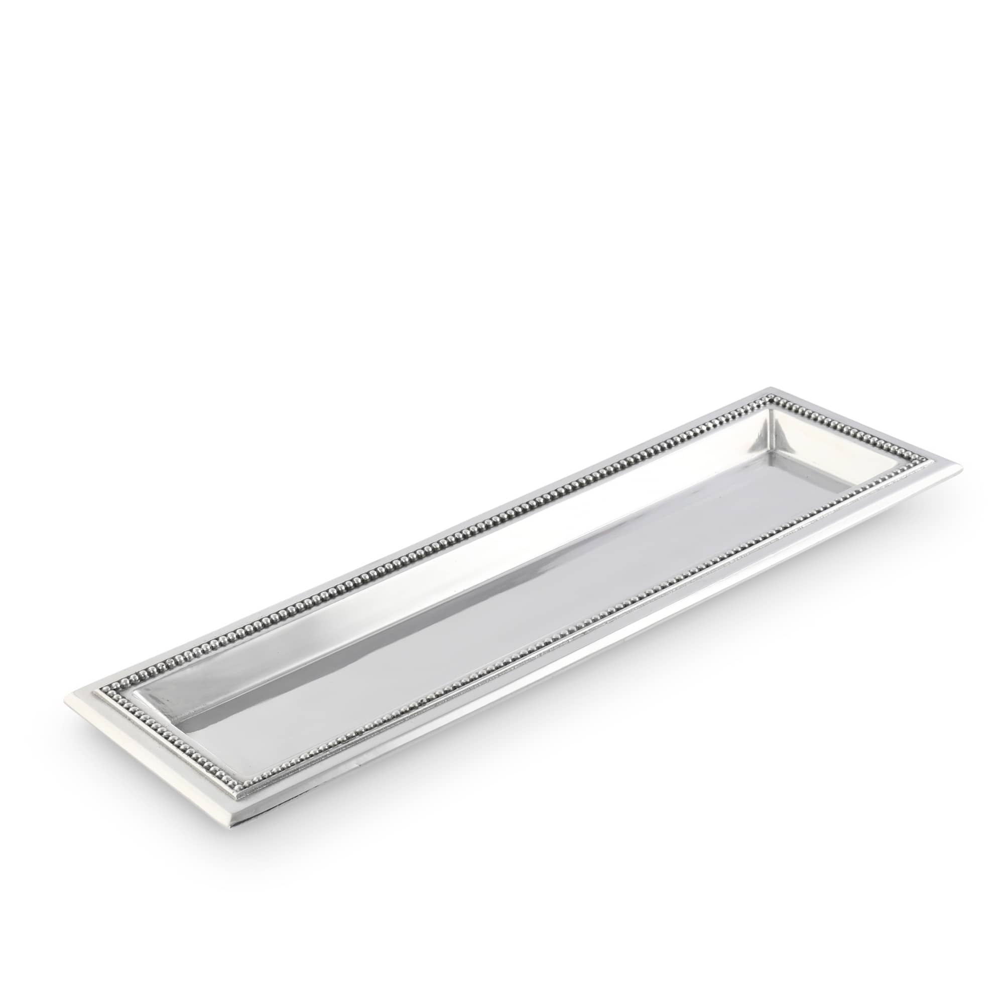 Crafted from polished aluminum with a silver-tone finish, this Arthur Court Beaded Oblong Serving Tray features a refined beaded edge that enhances any table setting. Its elongated shape is ideal for serving bread, appetizers, or desserts, combining style with practical versatility. Suitable for both casual and formal occasions, the tray is designed for easy maintenance and long-lasting use, making it a valuable addition to your serveware collection.