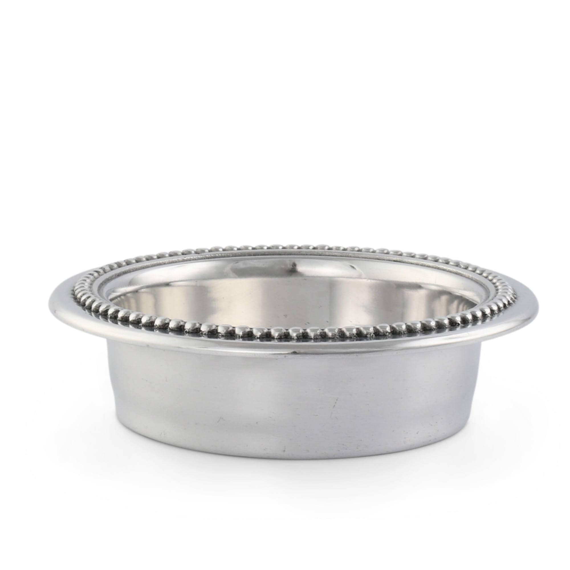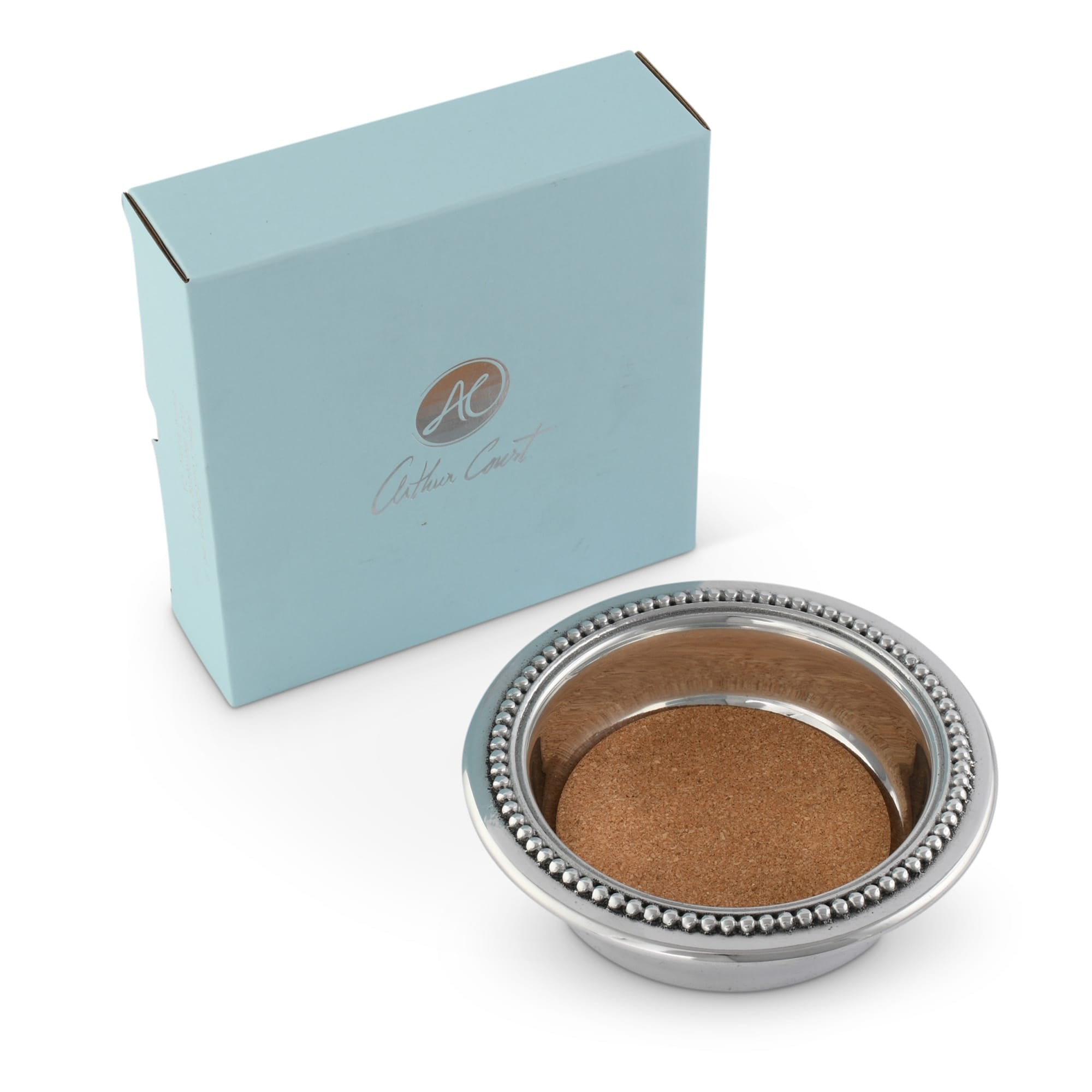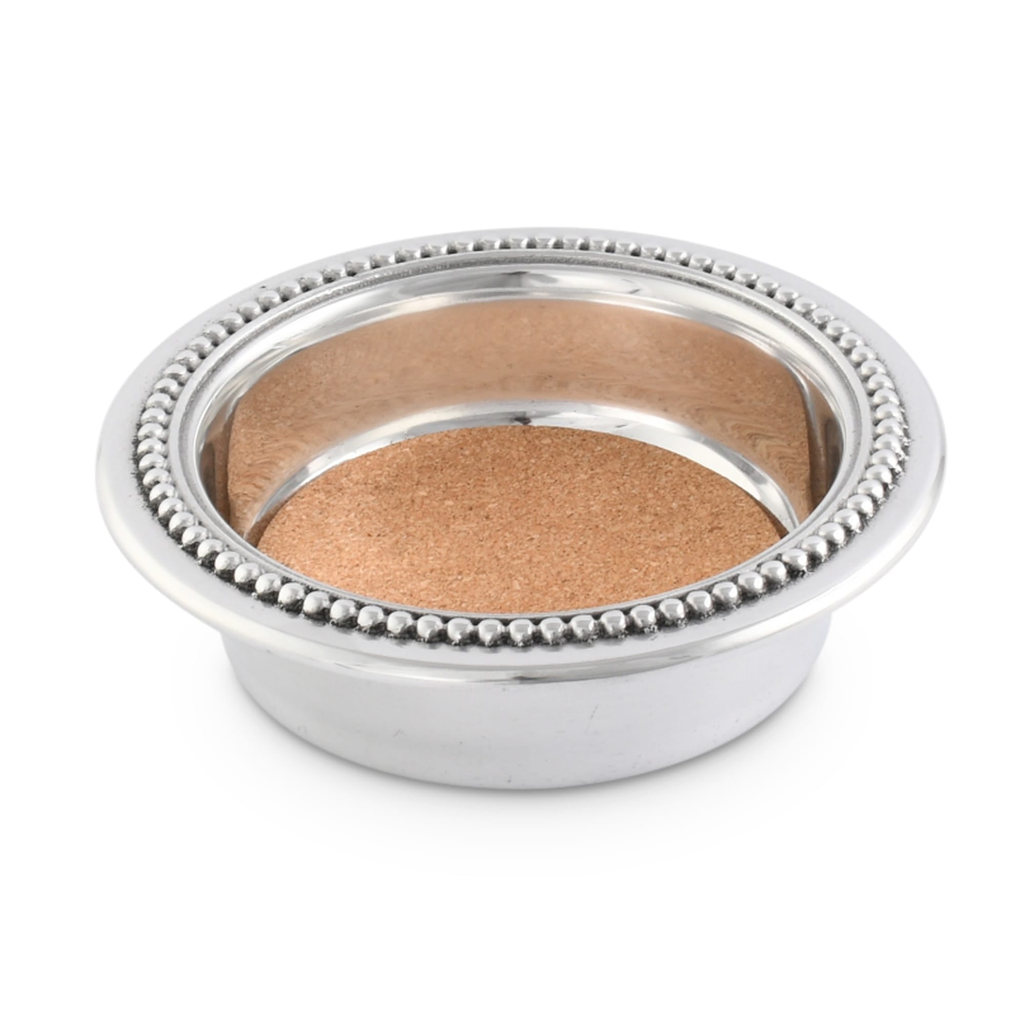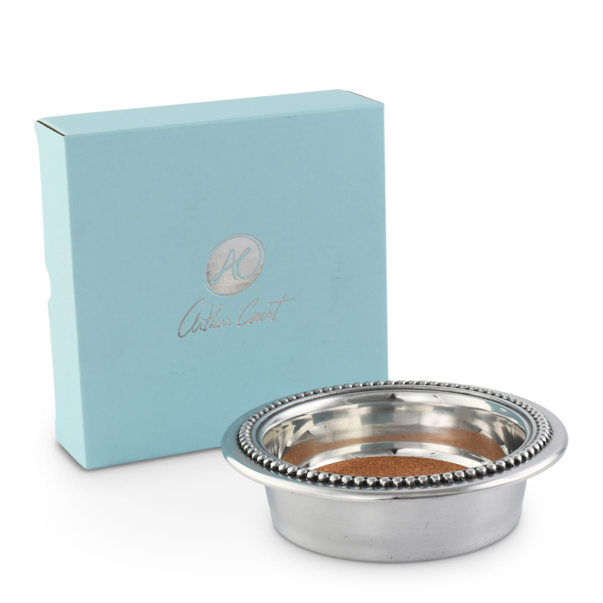 This Arthur Court wine coaster features a polished aluminum construction with a silver-tone finish and a distinctive beaded edge. The cork base provides a stable, non-slip surface that protects furniture from moisture and scratches while securely holding wine bottles. Its refined design suits both casual and formal settings, making it a practical and stylish addition to any home bar or dining area. An ideal gift for wine enthusiasts seeking functional elegance.