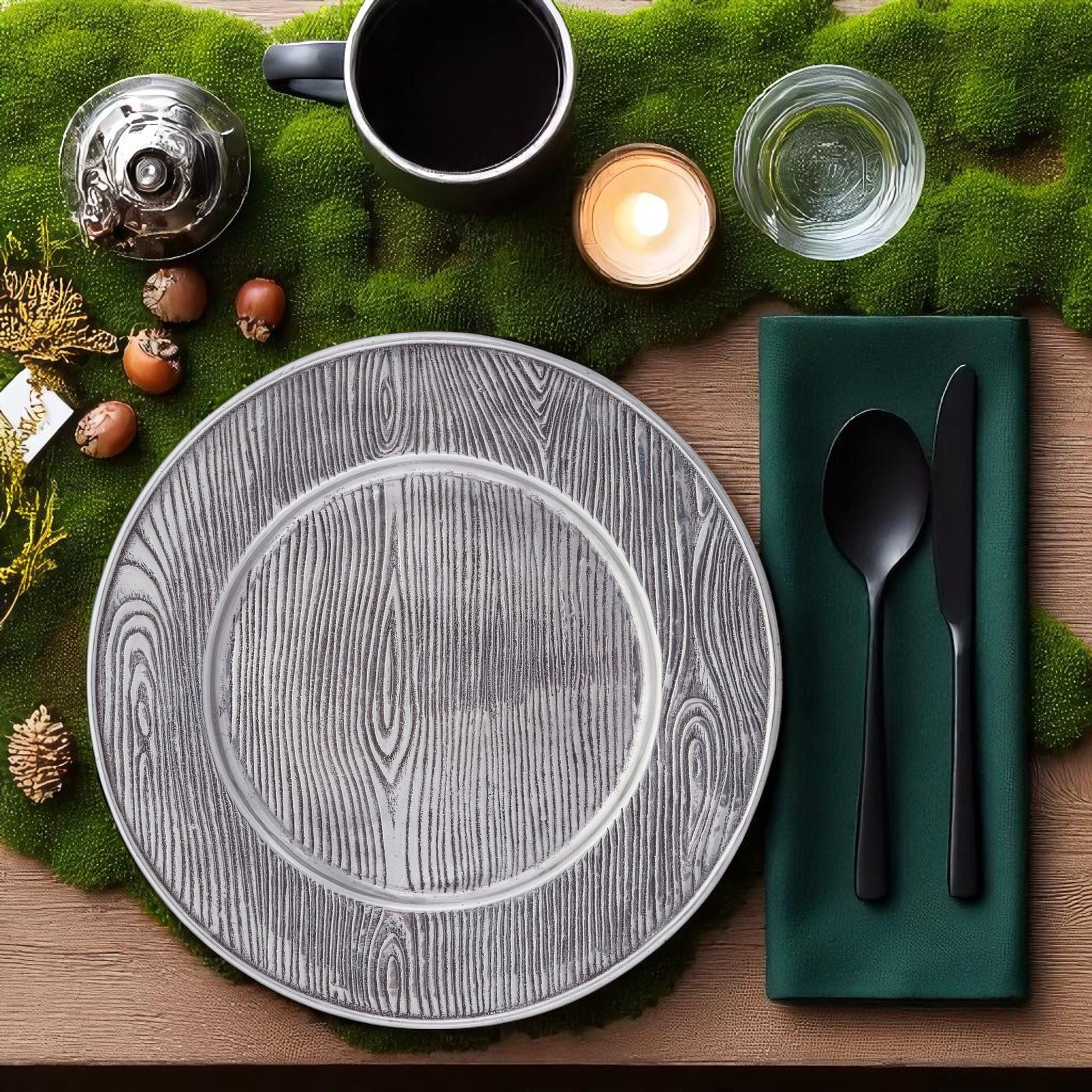 Presenting the Majestic Forest Collection's centerpiece: the Rustic Wood Grain Charger, Perfect for Dinner Parties. This Arthur Court Wood Grain Charger is more than just a dining accessory, it's the embodiment of refined taste and elegance. Skilfully crafted with intricate details, it mirrors the allure of natural wood, creating an aesthetic that's perfect for any occasion. Its versatility makes it an Arthur Court Wood Grain Charger: Ideal Wedding Gift or a Beautifully Designed Wooden Charger for Birthday Gift. Either way, it's a genuine expression of your exceptional taste.