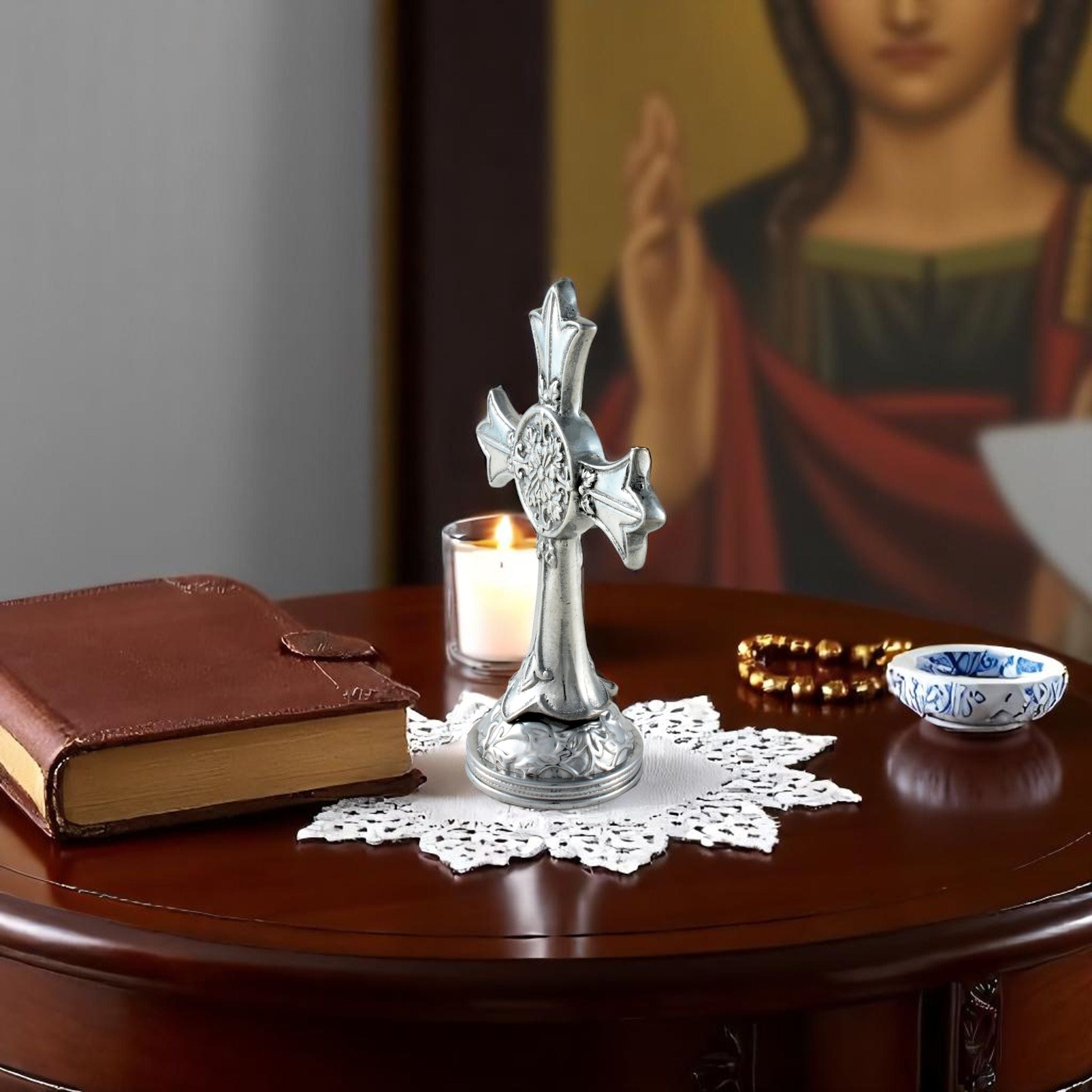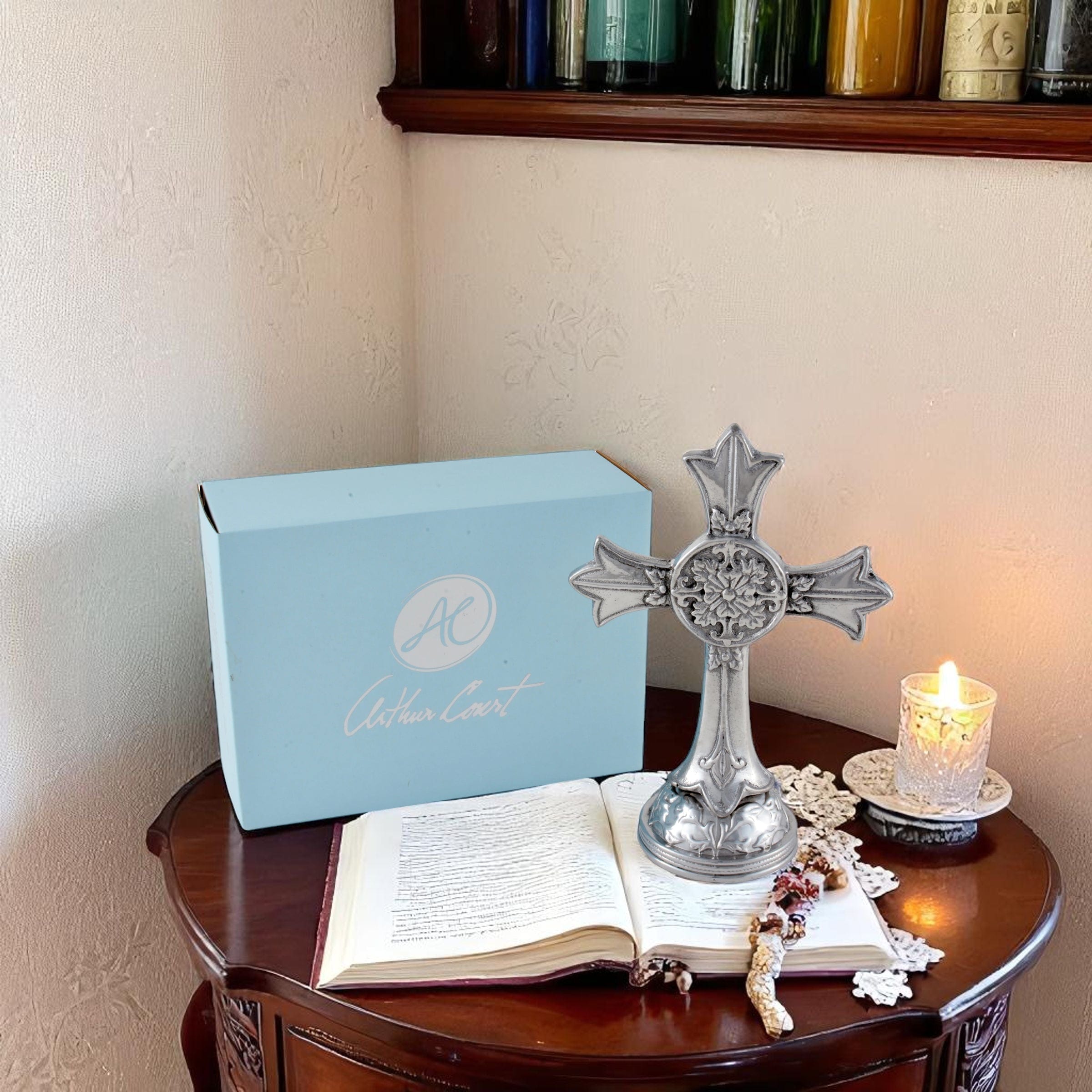 The flower that adorns the center of this cross is a rosette, standing for the power of rebirth. Whether you are celebrating great achievements, new beginnings, or other blessings, this medallion cross by Arthur Court is a precious way to commemorate the day. The three-pointed tips represent the pope's three-tiered crown, used at papal coronations for many centuries, and the fleur-di-lis, symbol of the holy trinity, adorns the bottom of the cross to add a beautiful embellishment. This miraculous figure requires no polishing thanks to its hand-polished aluminum alloy construction, and each handcrafted piece is slightly unique. Its round base provides a stable foundation, and you can proudly display this Arthur Court medallion cross in your home or office as a reminder of the important things in life.
